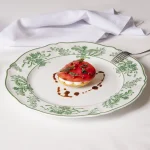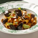 MELANZANA AFFUMICATA E BASILICO, POLVERE DI POMODORO E FONDUTA DI PARMIGIANO